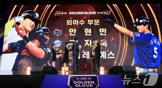 9일 오후 서울 송파구 롯데호텔 월드에서 열린 프로야구 2025 신한 SOL뱅크 골든글러브 시상식에서 외야수 부문 골든글러브를 수상한 삼성 구자욱, KT 안현민, 롯데 레이예스(박준혁 단장 대리수상)이 트로피를 받고 있다. 2025.12.9/뉴스1 © News1 김진환 기자