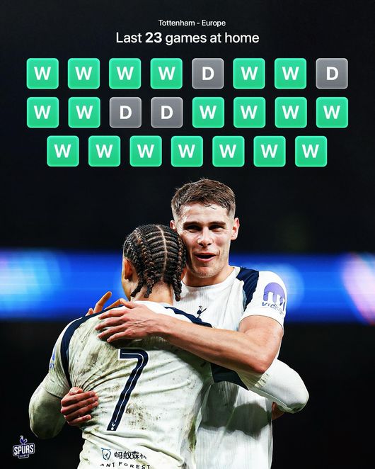 대단한 건 토트넘이 UEFA 주관 대회 기준 안방에서 23경기째 패하지 않고 있다는 점이다. 마지막 패배는 5년도 더 거슬러 올라가야 한다. 토트넘은 2020년 2월 라이프치히에 0-1로 패한 뒤로 홈에서 19승 4무를 거두고 있다.