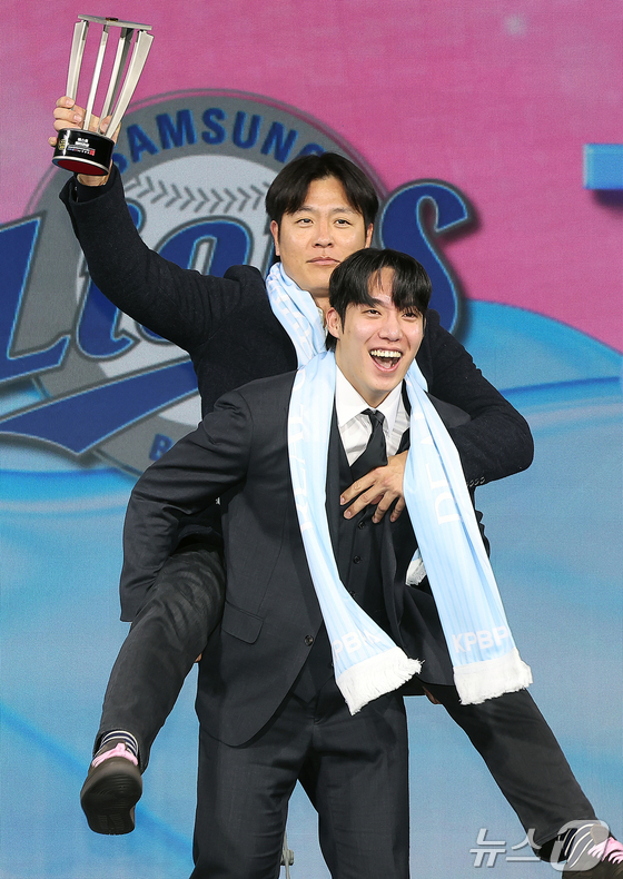 삼성 라이온즈 강민호와 원태인이 1일 서울 광진구 그랜드 워커힐 호텔에서 열린 한국프로야구선수협회 '2025 컴투스프로야구 리얼글러브 어워드'에서 베스트 배터리상을 수상한 후 기념 촬영을 하고 있다. 리얼글러브 어워드는 KBO리그 포지션별 최고의 '수비수'를 선정하는 시상식으로 선수들이 직접 투표해 수상자를 가린다. 2025.12.1/뉴스1 © News1 김진환 기자