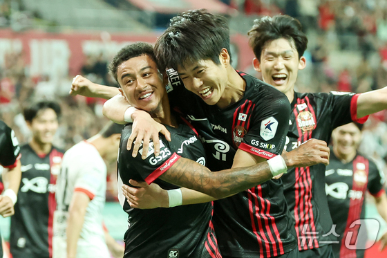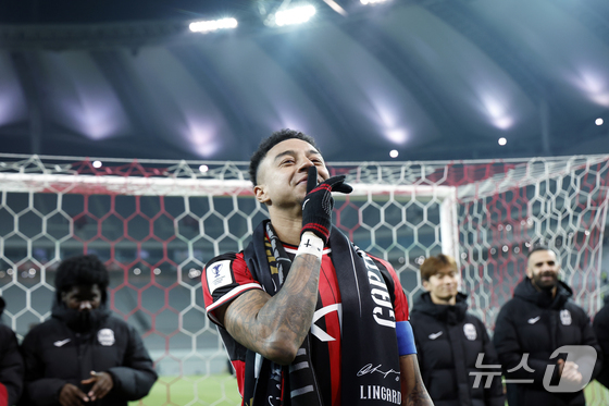 10일 오후 서울시 마포구 월드컵로 서울월드컵경기장에서 열린 AFC 챔피언스리그 엘리트(ACLE) 2025/26 리그 스테이지 6차전 FC서울과 멜버른시티FC의 경기 종료 후 진행된 환송행사에서 서울 린가드 서포터즈 수호신과 함께 세리머니를 하고 있다. 2025.12.10/뉴스1 © News1 박정호 기자