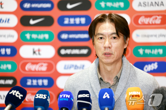 홍명보 축구 국가대표팀 감독이 지난 5일(현지시각) 미국 워싱턴DC 케네디센터에서 열린 '2026 북중미 월드컵 조 추첨식'을 마치고 12일 인천국제공항 제2여객터미널에서 기자들의 질문에 답변하고 있다. 한국은 멕시코, 남아프리카공화국, 유럽 플레이오프 D조(덴마크, 북마케도니아, 체코, 아일랜드)승자와 함께 A조에서 32강 진출을 두고 격돌한다. 2025.12.12/뉴스1 © News1 이호윤 기자