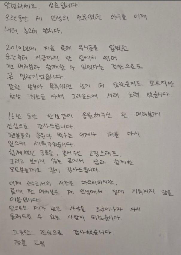 끝으로 그는 "롯데 팬 여러분은 제 인생에서 절대 지워지지 않을 이름"이라며 "앞으로도 제가 받은 사랑을 조금이나마 다시 돌려 드릴 수 있는 사람이 되겠다"고 인사말을 전했다.