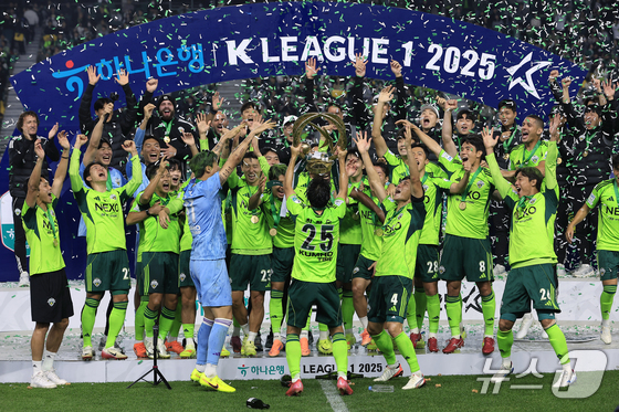 전북현대 구단의 모든 리그 우승(10회)을 경험한 레전드 원클럽맨 최철순이 8일 오후 전북 전주시 덕진구 기린대로 전주월드컵경기장에서 열린 하나은행 K리그1 2025 36라운드 전북현대와 대전하나시티즌의 경기 종료 후 우승 트로피 리프팅 세리머니를 하고 있다. 2025.11.8/뉴스1 © News1 박정호 기자