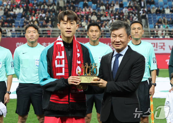 14일 오후 대전 유성구 대전월드컵경기장에서 열린 ‘하나은행 초청 국가대표팀 친선경기’ 대한민국과 볼리비아의 경기에서 정몽규 대한축구협회장이 센추리클럽에 가입한 이재성에게 기념패를 전달하고 있다. 2025.11.14/뉴스1 © News1 김기태 기자