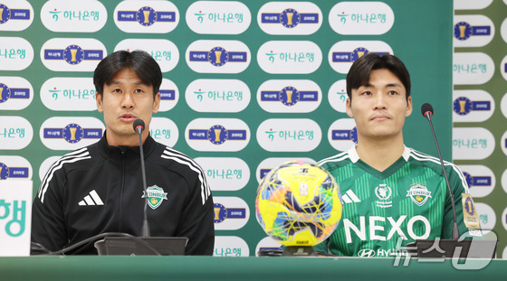 정조국 전북현대 코치(왼쪽)가 5일 서울 마포구 서울월드컵경기장에서 열린 2025 하나은행 코리아컵 공식 기자회견에서 결승전을 앞둔 소감을 밝히고 있다. 2025.12.5/뉴스1 © News1 박지혜 기자