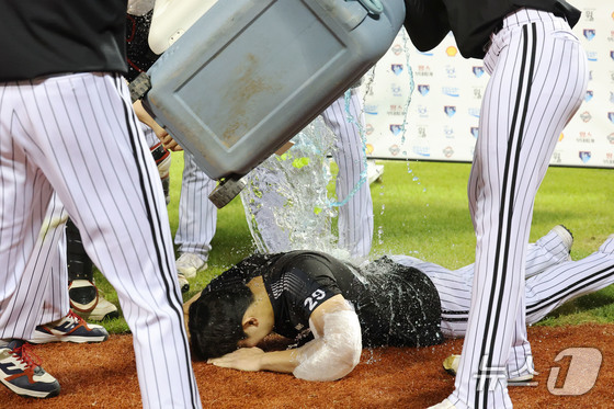 프로 데뷔 후 첫 시즌 10승을 달성한 LG 트윈스 투수 손주영이 10일 프로야구 두산 베어스전 종료 후 물세례와 함께 동료들의 축하를 받고 있다. 2025.9.10/뉴스1 © News1 이광호 기자