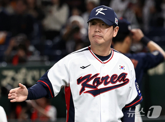 류지현 감독이 이끄는 야구 국가대표 선수들이 16일 오후 일본 도쿄돔에서 열린 월드베이스볼클래식(WBC) 대비 평가전 '2025 케이 베이스볼 시리즈(K-BASEBALL SERIES)' 일본과의 2차전 경기에서 일본과 7대7로 비긴 뒤 그라운드를 나서고 있다. 2025.11.16/뉴스1 © News1 구윤성 기자