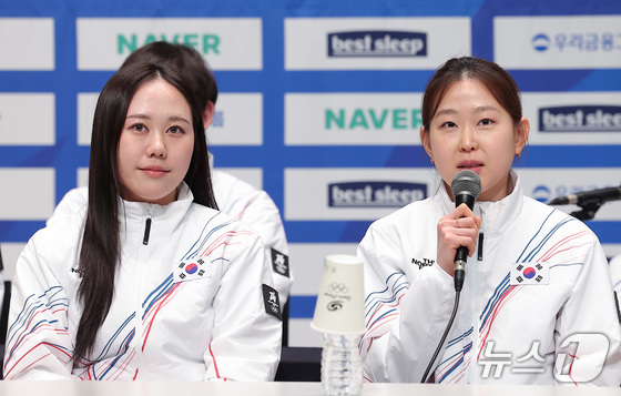 7일 밀라노 코르티나 동계 올림픽 D-30 미디어데이에 참석한 박지우와 김민선(왼쪽부터)이 취재진과 만나 인터뷰 하고 있다. ⓒ News1