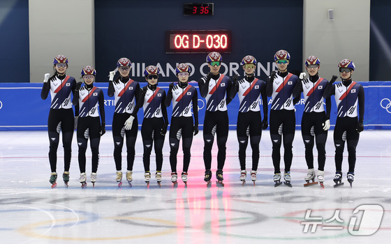 쇼트트랙 선수들이 7일 충북 진천선수촌 챔피언하우스에서 열린 2026 밀라노코르티나동계올림픽대회 D-30 미디어데이 및 훈련 공개에서 기념촬영을 하고 있다. 2026.1.7/뉴스1 © News1 김성진 기자