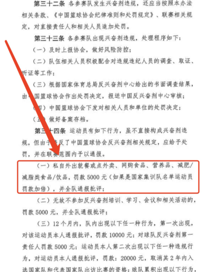 이번 세칙에서 가장 논란이 되는 부분은 선수의 일상 식생활까지 관리 대상에 포함시킨 점이다. 선수는 자신의 체내로 들어가는 모든 물질에 책임을 져야 하며, 외출 시 외식이나 배달 음식, 온라인 구매 식품과 영양제, 다이어트·체지방 감량 관련 음식·음료까지 규제 대상에 포함된다. 이를 위반하면 벌금 5,000위안이 부과되며, 국가대표팀 소속 선수는 벌금이 두 배로 증가한다. 위반 사실은 팀 전체에 공지되어 내부 비판을 받게 된다.