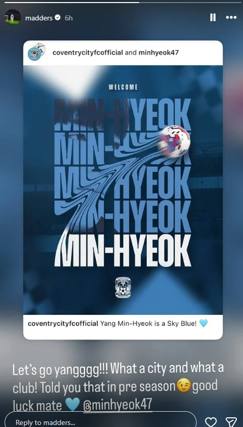 (MHN 오관석 기자) 제임스 매디슨이 코번트리 시티로 임대 이적한 양민혁에게 응원의 메시지를 전했다.