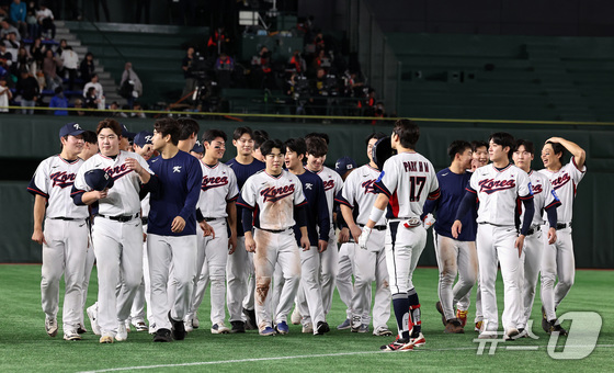 류지현 감독이 이끄는 야구 국가대표 선수들이 16일 오후 일본 도쿄돔에서 열린 월드베이스볼클래식(WBC) 대비 평가전 '2025 케이 베이스볼 시리즈(K-BASEBALL SERIES)' 일본과의 2차전 경기에서 일본과 7대7로 비긴 뒤 그라운드를 나서고 있다. 2025.11.16/뉴스1 © News1 구윤성 기자