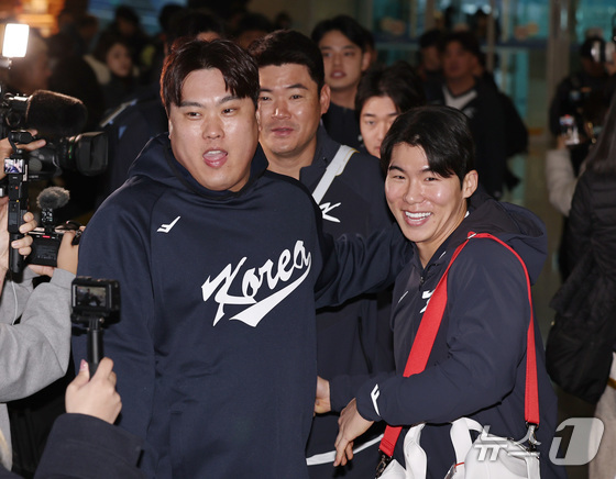 야구 국가대표팀 류현진(왼쪽부터), 노경은, 김혜성이 9일 오전 인천국제공항 제1여객터미널에서 월드베이스볼클래식(WBC) 대비 1차 전지훈련을 위해 사이판으로 출국하고 있다. 2026.1.9/뉴스1 © News1 구윤성 기자