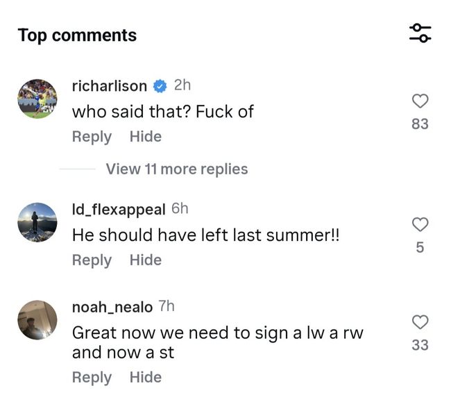 하지만 히샬리송은 즉각 소문을 차단했다. 그는 코울린 기자의 게시글에 "누가 그래? 저리 꺼져(Fu** off)"라고 직접 댓글을 남겼다. 사실상 자신은 토트넘에 남을 생각이라는 선언이었다.
