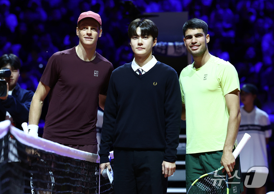 카를로스 알카라스와 얀니크 신네르가 10일 오후 인천 중구 인스파이어 아레나에서 열린 '현대카드 슈퍼매치 14'에서 경기에 앞서 엑소 세훈과 기념촬영을 하고 있다. 2026.1.10/뉴스1 © News1 김민지 기자