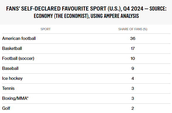 영국 경제지 이코노미스트에 따르면 미국인의 10%가 축구를 가장 좋아하는 스포츠로 선택했으며, 이는 9%에 그친 야구를 근소하게 앞선 수치다. 축구는 미식축구와 농구에 이어 전체 선호도 3위에 올랐다.