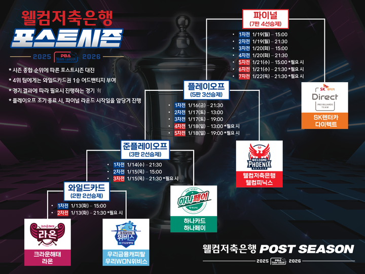 PBA팀리그 포스트시즌은 13일 오후 3시 크라운해태-우리금융캐피탈의 와일드카드 1차전(2전 2선승제) 경기로 막을 올린다.