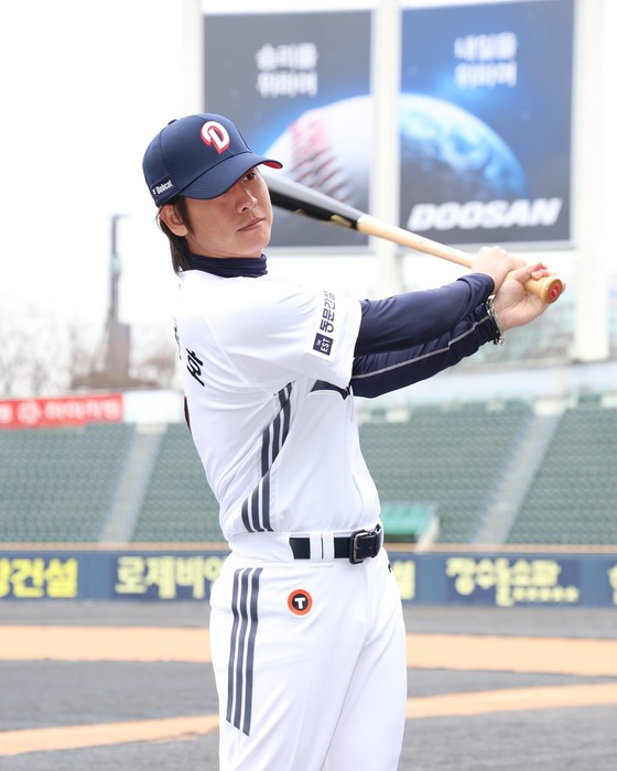 두산 베어스 내야수 박찬호가 15일 서울 잠실야구장에서 열린 구단 창단 기념식을 마친 뒤 사진을 촬영하고 있다. 2026.1.15/뉴스1 © News1 이상철 기자
