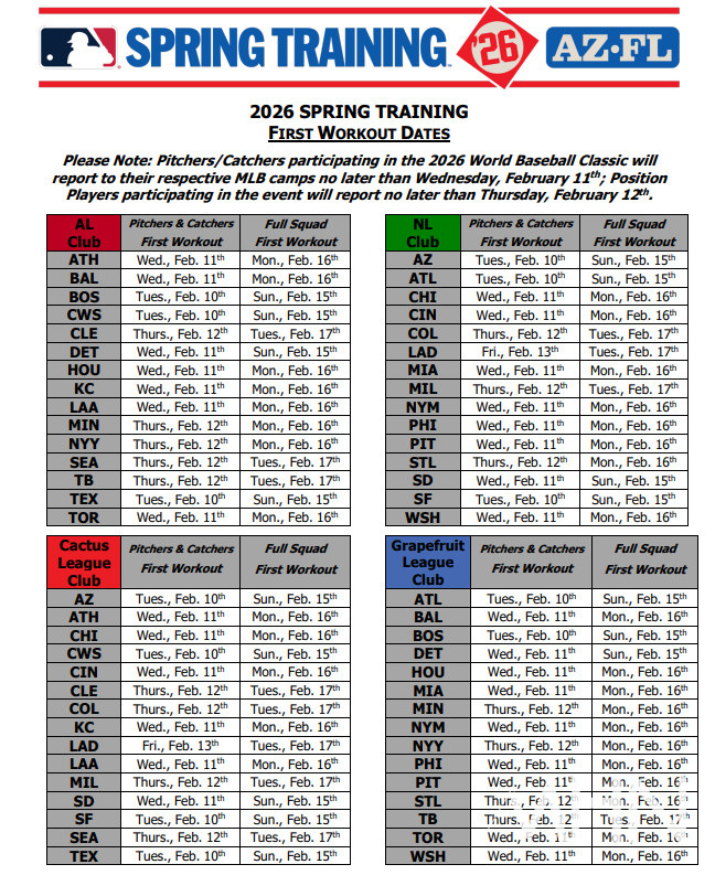 메이저리그 사무국은 15일(한국시간) MHN에 보내온 보도자료를 통해 ‘2026 메이저리그 스프링캠프 일정’을 발표했다. 메이저리그 스프링캠프는 미국 애리조나주와 플로리다주 두 곳에서 열린다.
