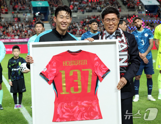 한국 남자 선수 A매치 최다 출전한 손흥민이 14일 오후 서울 마포구 서울월드컵경기장에서 열린 하나은행 초청 축구국가대표팀 친선경기 대한민국과 파라과이의 경기 시작 차범근 전 감독에게 기념 유니폼을 전달받고 기념촬영을 하고 있다. 2025.10.14/뉴스1 © News1 김명섭 기자