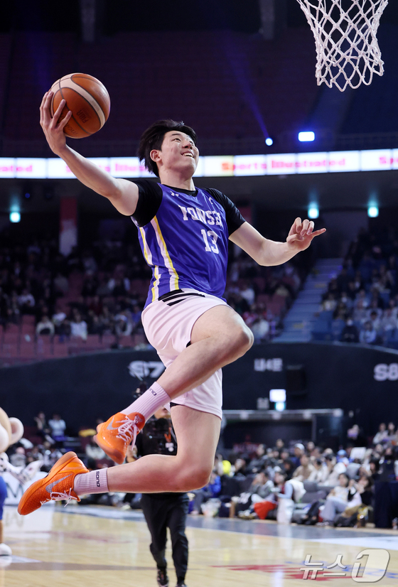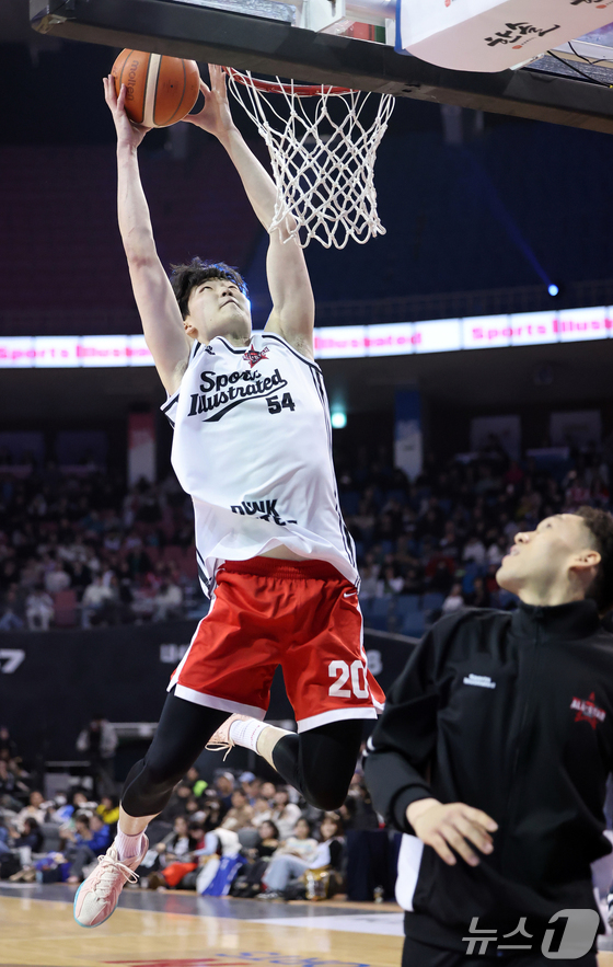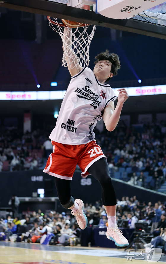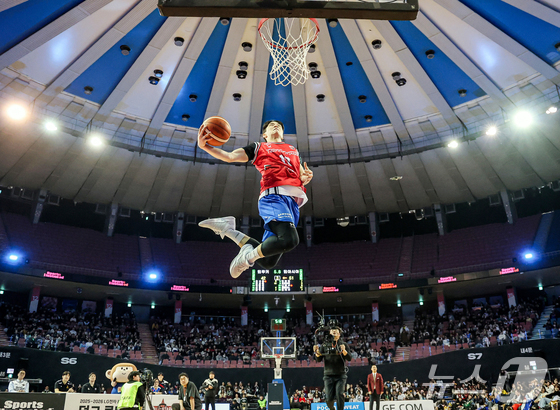 17일 오후 서울 송파구 잠실실내체육관에서 열린 2025-2026 LG전자 프로농구 올스타전 전야제 덩크 콘테스트에서 서울 SK 김명진이 호쾌한 덩크슛을 하고 있다. 2026.1.17/뉴스1 © News1 김진환 기자