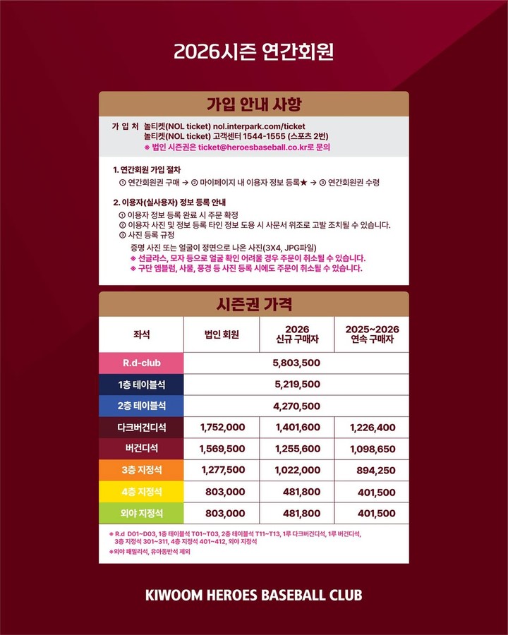 직전 2025시즌 연간회원은 먼저 가입할 수 있다. 동일 좌석 재구매를 원하는 회원은 20일부터 25일까지 놀티켓 고객센터를 통해 신청할 수 있으며, 좌석 변경을 희망하는 회원은 다가오는 26일부터 29일까지 놀티켓 홈페이지에서 변경 가입할 수 있다.