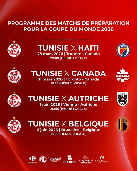 튀니지 축구협회는 21일(이하 한국시간) 공식 채널을 통해 "2026 월드컵에 대비한 경기 일정"이라며 오는 3월과 6월 A매치 친선전 일정을 최종 발표했다.