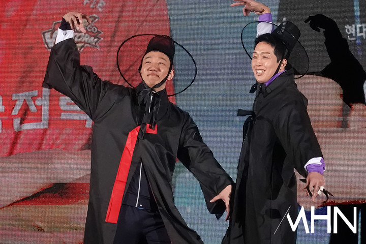 특히 최민호(현대캐피탈)와 신영석(한국전력)이 눈에 탁 들어오는 등장신으로 시선을 강탈했다. 두 사람은 인기 애니메이션 '케이팝 데몬 헌터스'를 의식한 듯한 저승사자 코스프레를 선사했다.