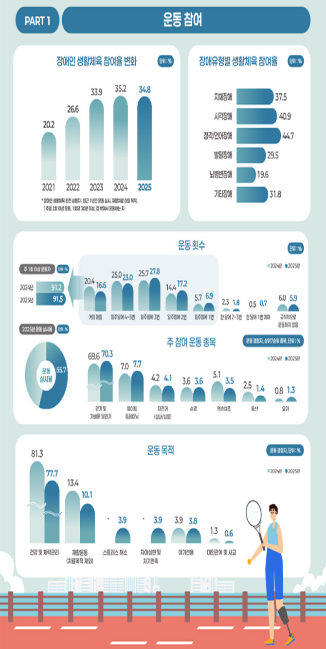 문화체육관광부는 대한장애인체육회와 함께 실시한 ‘2025년 장애인 생활체육조사’ 결과, 장애인 생활체육 참여율이 34.8%로 전년 대비 0.4%포인트 감소했다고 28일 밝혔다.
