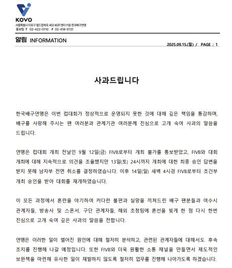 KOVO컵 파행 당시 한국배구연맹이 발표한 사과문