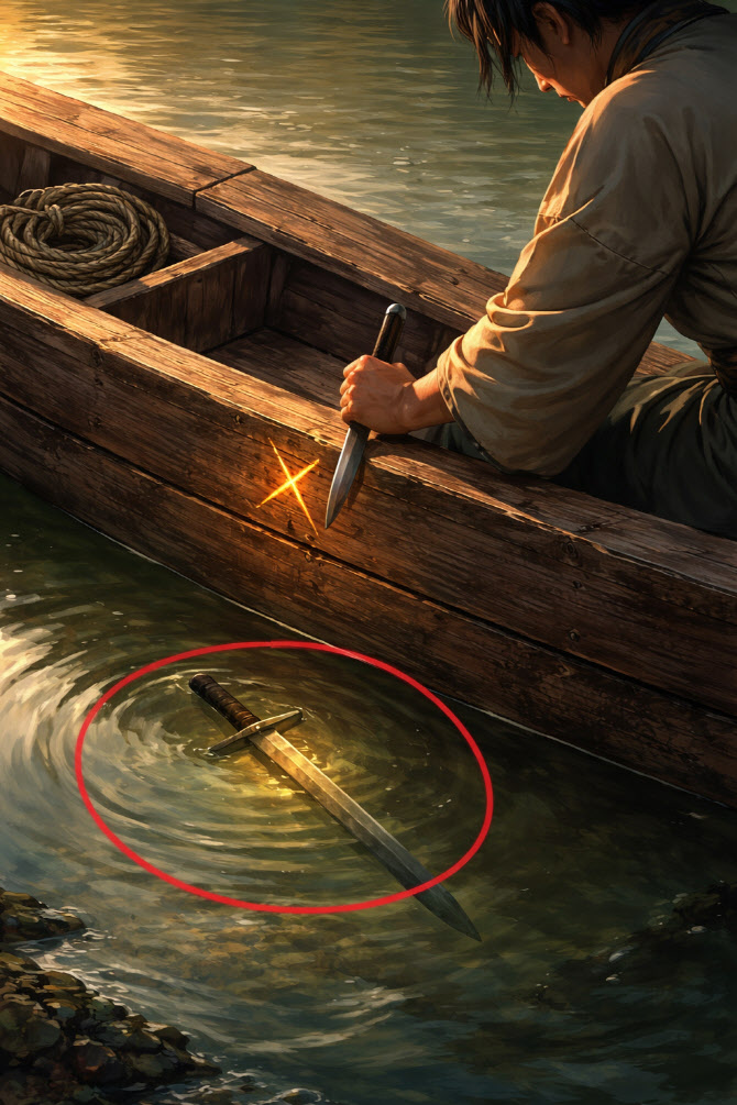 각주구검, 배가 움직였다는 사실을 잊고, 칼을 떨어뜨린 뱃전에만 표시해두었다가 나중에 그 자리에서 칼을 찾으려는 어리석음을 뜻하는 고사성어. 2025년 한국 스포츠에 딱 어울리는 말이었다. 사진=AI 생성