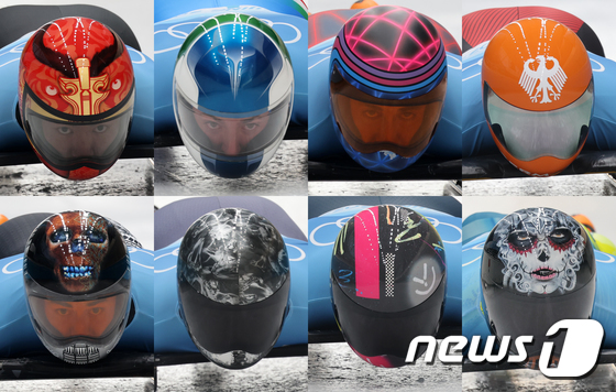 10일 중국 옌칭 국립 슬라이딩 센터에서 열린 2022 베이징 동계올림픽 스켈레톤 남자 2차 시기에 참가한 세계 각국의 선수들이 다양한 그림의 헬멧을 쓰고 있다. 2022.2.10/뉴스1 © News1 안은나 기자