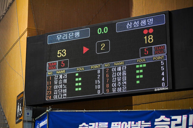 반면 우리은행은 1쿼터 실책이 0이었다. 우리은행은 상대의 실책을 무려 14개의 3점슛으로 시도해 6개를 성공했다. 우리은행은 17-2로 달아났다. 작전시간 뒤에도 삼성생명은 전혀 정신을 차리지 못했다. 1쿼터가 끝났을 때 이미 점수차는 29-6으로 돌이키기 힘든 수준이었다.