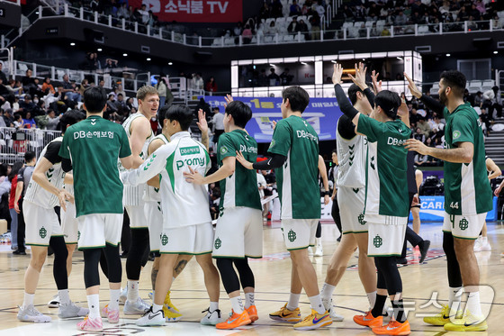 1일 오후 경기 수원KT소닉붐아레나에서 열린 2025-2026 LG전자 프로농구 수원 KT와 원주 DB의 경기에서 96대 89로 승리한 DB선수들이 기쁨을 나누고 있다. 2026.2.1/뉴스1 © News1 이광호 기자
