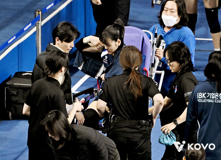끝내 일어나지 못한 임명옥은 트레이너의 부축을 받아 코트 밖으로 나왔고 들것을 타고 경기장을 떠났다.