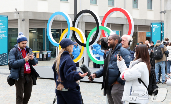 2026 밀라노 코르티나 동계올림픽을 사흘 앞둔 3일(현지시간) 이탈리아 밀라노 올림픽 빌리지 내 대형 오륜기 모형 앞으로 각국 취재진들이 방송을 하고 있다. 2026.2.3/뉴스1 © News1 김진환 기자