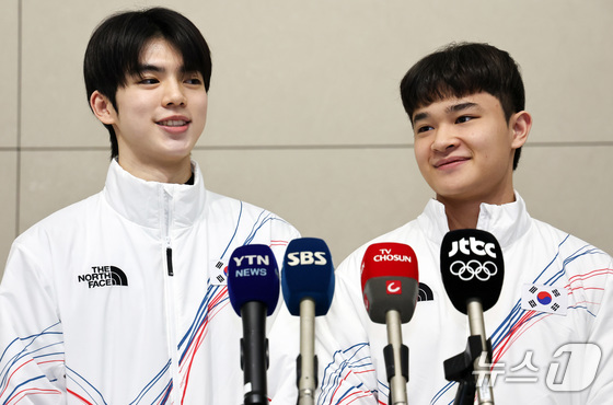2026 밀라노·코르티나담페초 동계올림픽에 출전하는 대한민국 피겨스케이팅 대표팀 차준환, 김현겸 선수가 4일 오전 인천국제공항 제2터미널을 통해 출국하며 취재진과 인터뷰를 하고 있다. 2026.2.4/뉴스1 © News1 최지환 기자