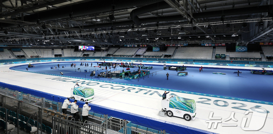 2026 밀라노·코르티나 담페초 동계올림픽 개막을 이틀 앞둔 4일(현지시간) 이탈리아 밀라노 스피드스케이팅 경기장에서 관계자들이 빙질을 관리하고 있다. 2026.2.4/뉴스1 © News1 김진환 기자