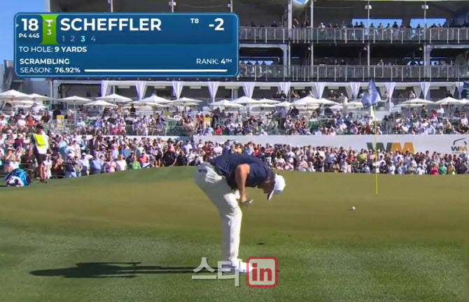스코티 셰플러가 6일(한국시간) 열린 PGA 투어 WM피닉스 오픈 18번홀에서 어프로치샷 실수를 한 뒤 자책하고 있다. (사진=PGA투어 영상 화면 캡쳐)