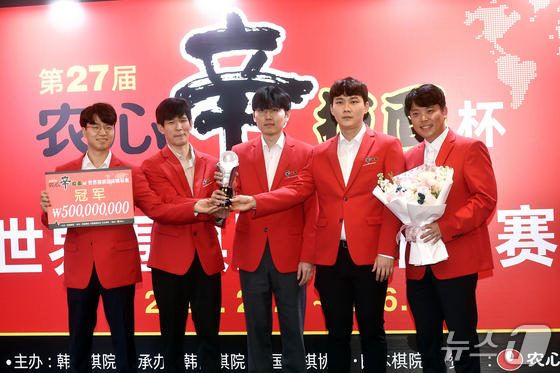 농심배 우승을 축하하는 한국 선수단의 안성준 9단, 이지현 9단, 신진서 9단, 박정환 9단, 홍민표 국가대표 감독(왼쪽부터). (한국기원 제공)