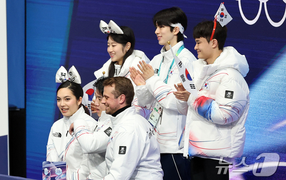 권예와 임해나가 6일(현지시간) 이탈리아 밀라노 아이스 스케이팅 아레나에서 열린 2026 밀라노·코르티나담페초 동계올림픽 피겨스케이팅 팀 이벤트(단체전) 아이스댄스(리듬댄스)에 참가해 연기를 마친 뒤 차준환, 이해인, 김현겸의 응원을 받고 있다. 2026.2.6 / © 뉴스1 김진환 기자