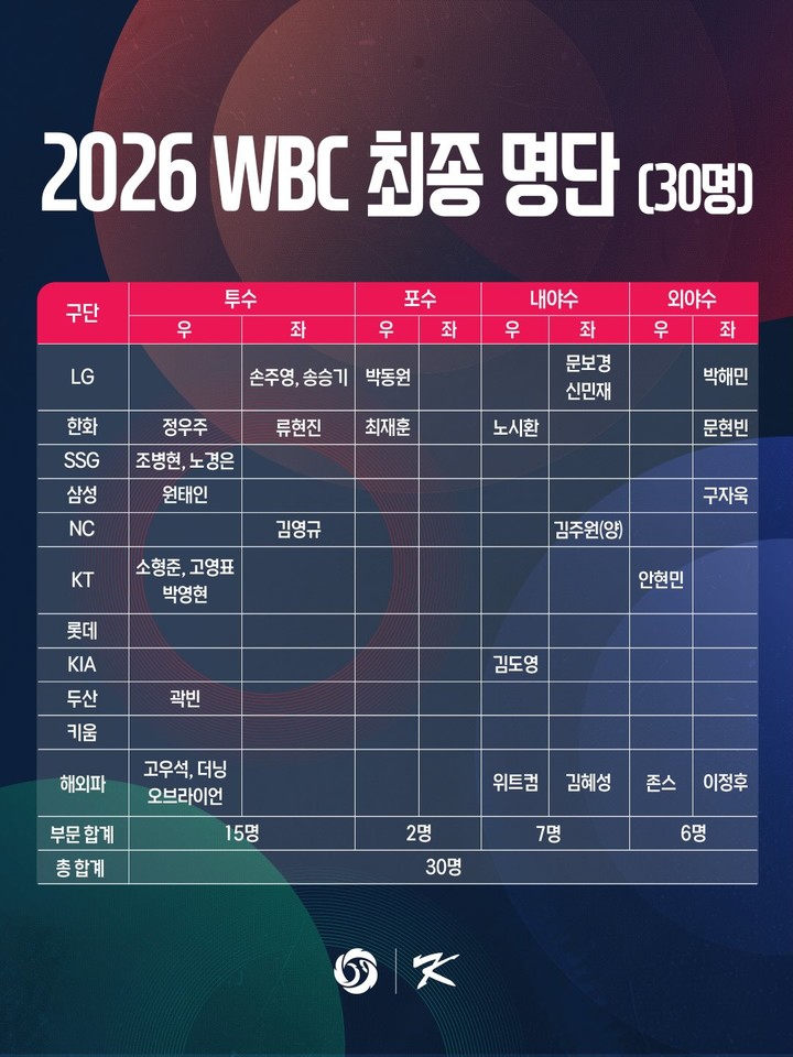 (MHN 금윤호 기자) 오는 3월 일본 도쿄에서 펼쳐지는 2026 월드베이스볼클래식(WBC)을 앞두고 태극마크를 달고 뛸 30명의 선수 명단이 확정됐다.