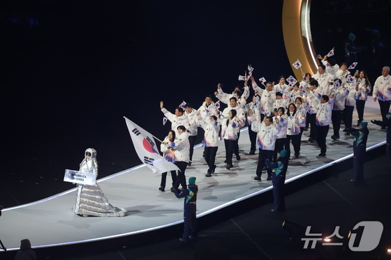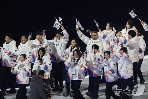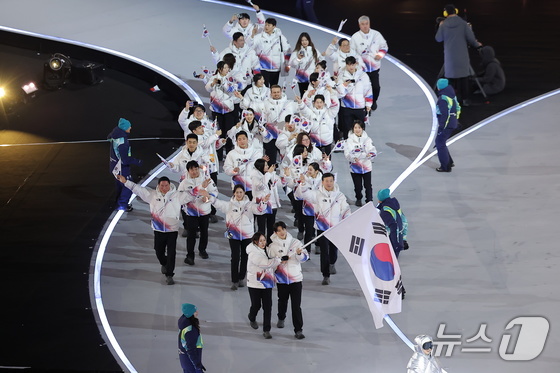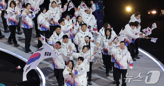 대한민국 선수단이 6일 오후(현지시간) 이탈리아 밀라노 산시로 올림픽 스타디움에서 열린 2026 밀라노·코르티나담페초 동계올림픽대회 개회식에 입장하고 있다. 2026.2.7 © 뉴스1 김진환 기자