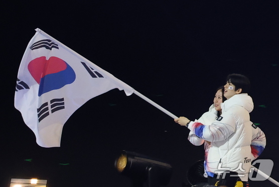 대한민국 선수단 기수 차준환(피겨 스케이팅)과 박지우(스피드 스케이팅)가 6일 오후(현지시간) 이탈리아 밀라노 산시로 올림픽 스타디움에서 열린 2026 밀라노·코르티나담페초 동계올림픽대회 개회식에서 선수단을 이끌고 입장하고 있다. 2026.2.7 © 뉴스1 김진환 기자