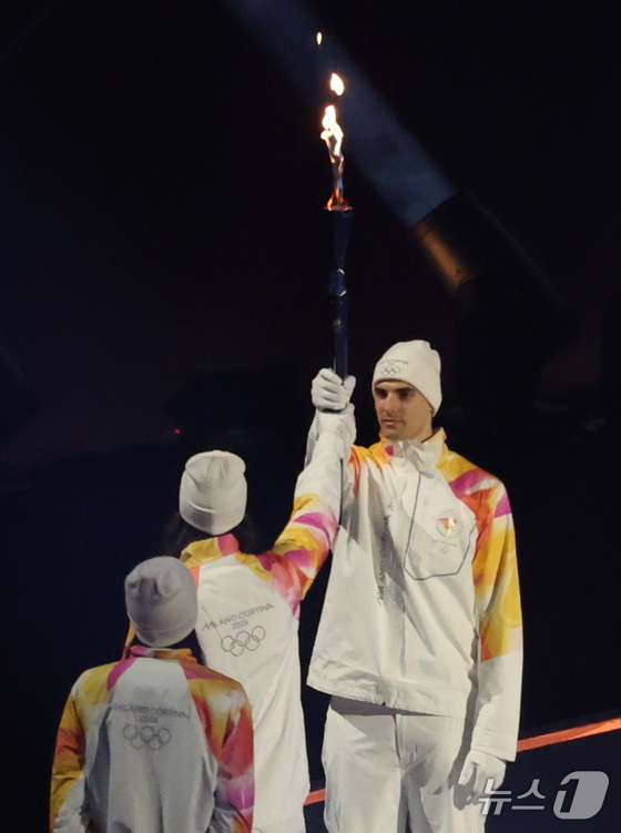 이탈리아 알파인 스킨 레전드 데보라 콤파뇨니, 엘베르토 톰바가 6일 오후(현지시간) 이탈리아 밀라노 산시로 올림픽 스타디움에서 열린 2026 밀라노·코르티나담페초 동계올림픽대회 개회식에서 성화를 점화하고 있다. 2026.2.7 © 뉴스1 김성진 기자