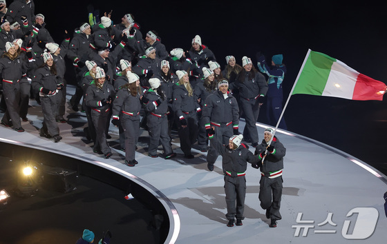 6일 오후(현지시간) 이탈리아 밀라노 산시로 올림픽 스타디움에서 열린 2026 밀라노·코르티나담페초 동계올림픽대회 개회식에서 이탈리아 선수단이 입장하고 있다. 2026.2.7 © 뉴스1 김성진 기자