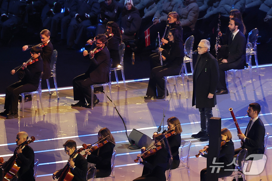 테너 안드레아 보첼리가 6일 오후(현지시간) 이탈리아 밀라노 산시로 올림픽 스타디움에서 열린 2026 밀라노·코르티나담페초 동계올림픽대회 개회식에서 성화 봉송에 앞서 공연을 선보이고 있다. 2026.2.7 © 뉴스1 김성진 기자