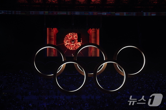 6일 오후(현지시간) 이탈리아 밀라노 산시로 올림픽 스타디움에서 열린 2026 밀라노·코르티나담페초 동계올림픽대회 개회식에서 이탈리아 알파인 스킨 레전드 데보라 콤파뇨니, 엘베르토 톰바가 성화를 점화하자 오륜기 로고 조형물에서 불꽃이 터지고 있다. 2026.2.7 © 뉴스1 김성진 기자