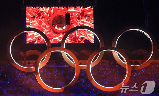 6일 오후(현지시간) 이탈리아 밀라노 산시로 올림픽 스타디움에서 열린 2026 밀라노·코르티나담페초 동계올림픽대회 개회식에서 이탈리아 알파인 스킨 레전드 데보라 콤파뇨니, 엘베르토 톰바가 성화를 점화하자 오륜기 로고 조형물에서 불꽃이 터지고 있다. 2026.2.7 © 뉴스1 김성진 기자
