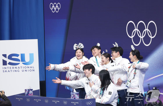 피겨 차준환이 7일(현지시간) 이탈리아 밀라노 아이스 스케이팅 아레나에서 열린 2026 밀라노·코르티나담페초 동계올림픽 피겨 스케이팅 팀 이벤트(단체전) 남자 싱글 쇼트 프로그램에서 연기를 마친 후 동료 선수들과 포즈를 취하고 있다. 2026.2.8 © 뉴스1 김성진 기자